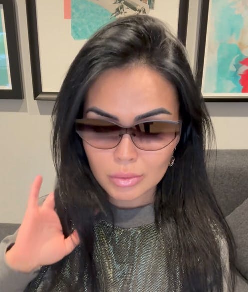 Woman wearing a black one-shoulder dress and sunglasses against a beige background