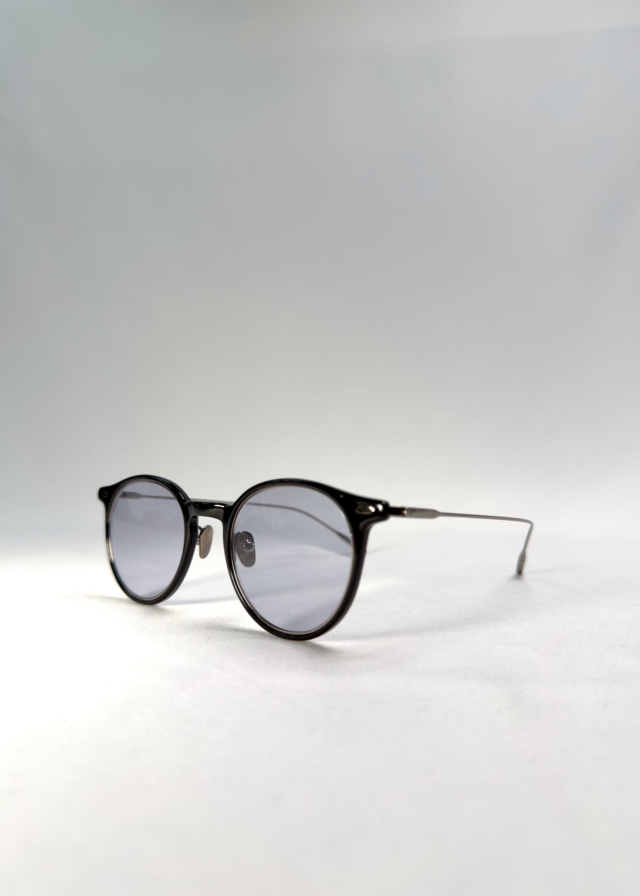 Its acetate–titanium hybrid frame blends deep black with a soft silver fade, paired with smoke-tinted Softint lenses that filter blue light and block UV400 rays.
