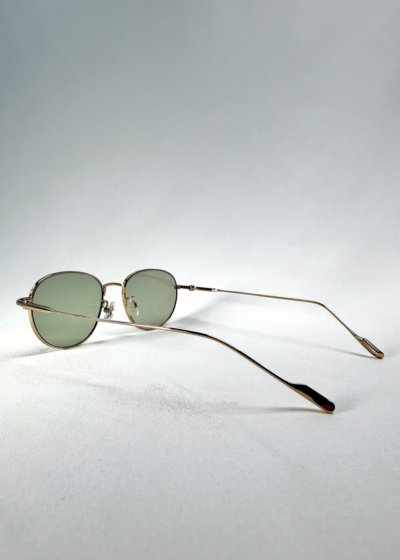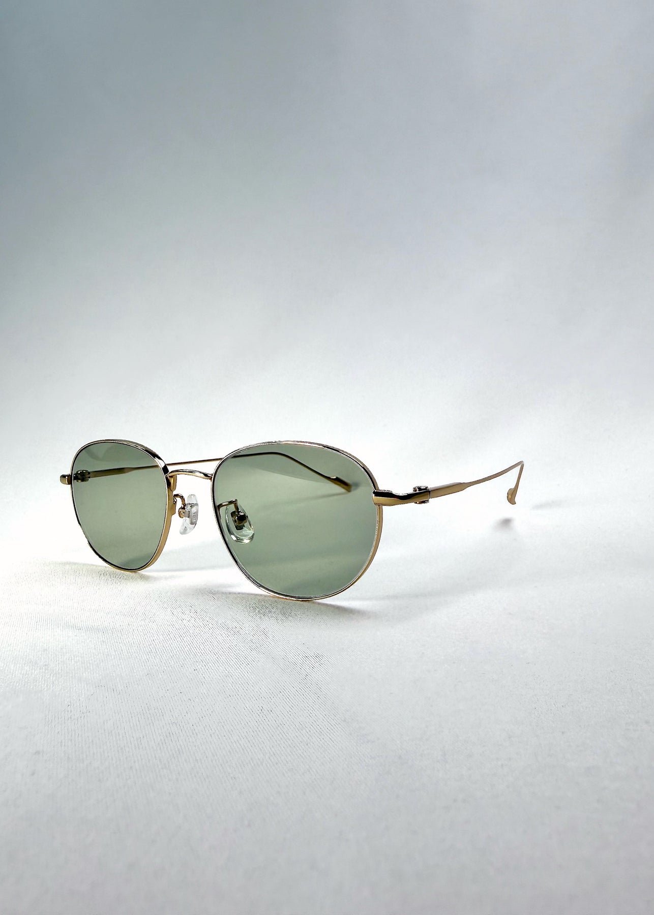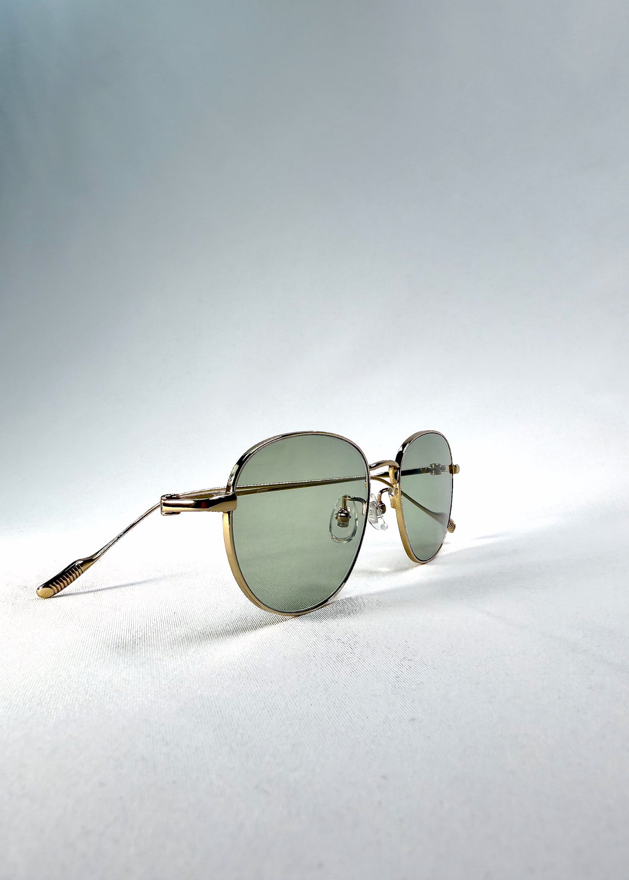 A golden stainless-steel frame holds pale green Softint lenses that calm glare while keeping the world vivid and alive.